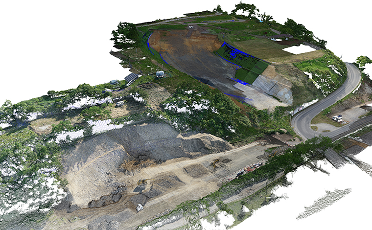 写真測量業務は、主にi-Constructionプロジェクトチームの中村理絵(なかむらりえ)様と藤井彩加(ふじいさやか)様、2名の女性社員(しかも異業種から転職して、まだ1年足らず)に任せているという。『TSトラッキングUAS』、そして3D点群処理ソフトウェア『MAGNET Collage』の使用感について、中村様は「標定点の設置が要らないことでの現場作業の時間短縮は、明らかに実感できています」。さらに藤井様は「実は現場の作業だけではありません。後処理でも標定点を抽出する作業が無くなるので、解析時間も大幅に短縮できているのです」と評価する。現在使用している業務は10万m3という大規模な道路整備工事の出来高計測。従来方法で行った場合、計測から成果作成まで4~5日程度かかるところ『TSトラッキングUAS』では2日で完了するそうだ。計測した翌日には成果が出せることになる。このスピード感は、工期短縮にも好影響に違いない。