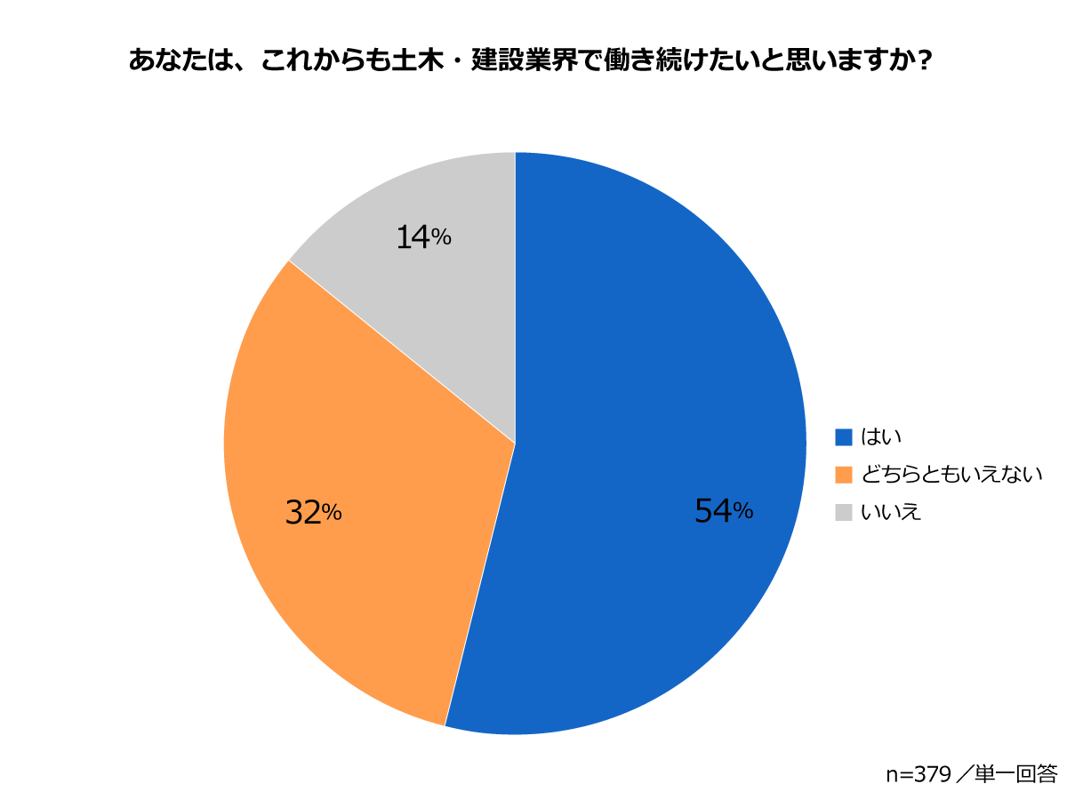 一方で、この結果からは土木・建設業界でキャリアを積み重ねていくことに懐疑的な人も、少なからず存在するとわかりました。こうした迷いや不安を持っている人たちを業界内に引き留められるかどうかが、土木・建設業界の活性化につながると考えられます。