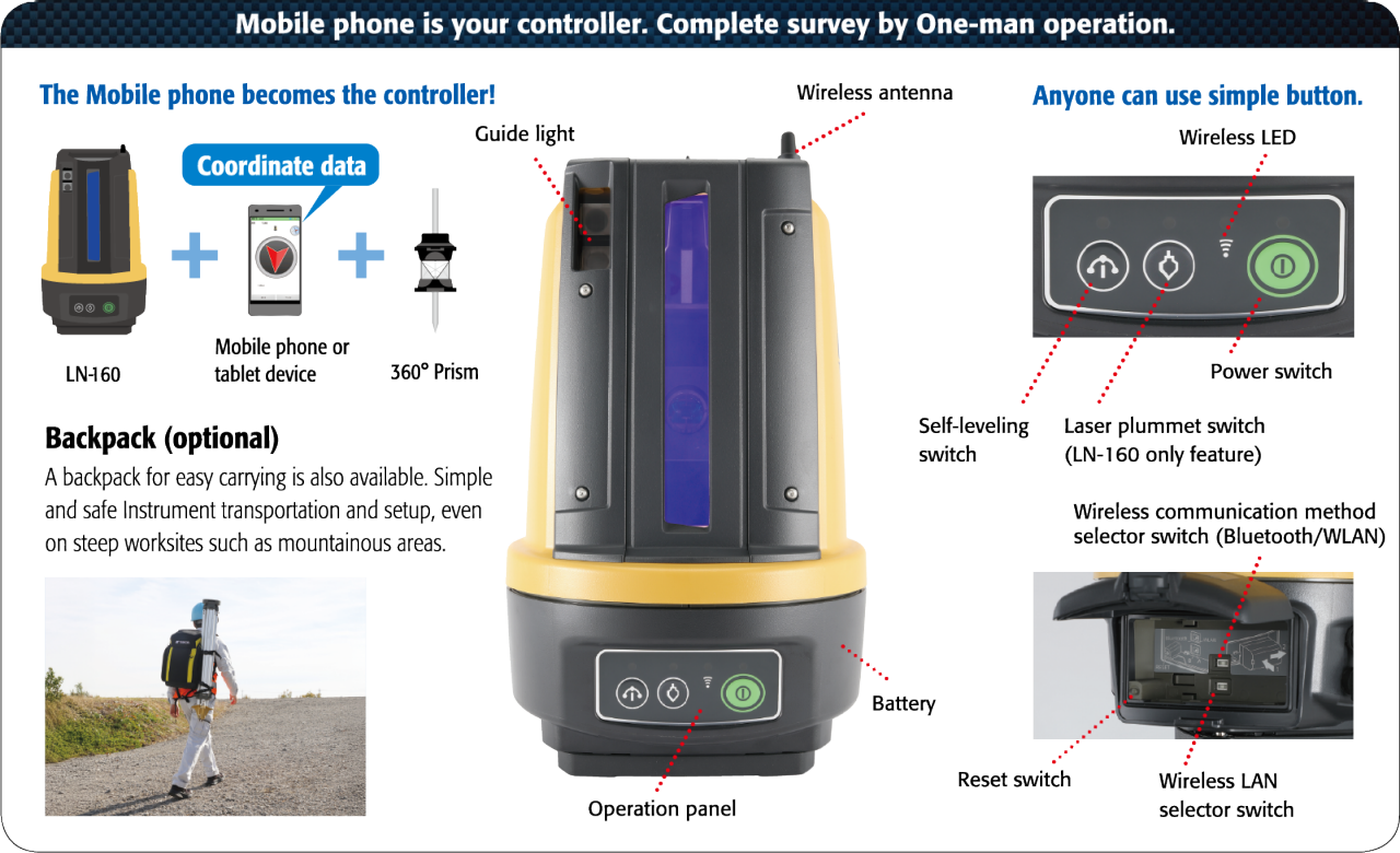 The tilt angle area has been expanded, with a maximum elevation angle of +55°, and a maximum depression angle of –32°. The measurement range is 260m in diameter, ensuring sufficient working space for everything from ICT with construction machinery to stake-outs for civil engineering.