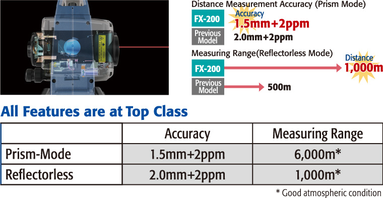 Especially effective in surveying control points that require high-accuracy, and in cross sectional surveying in large areas with reflectorless measurement mode.