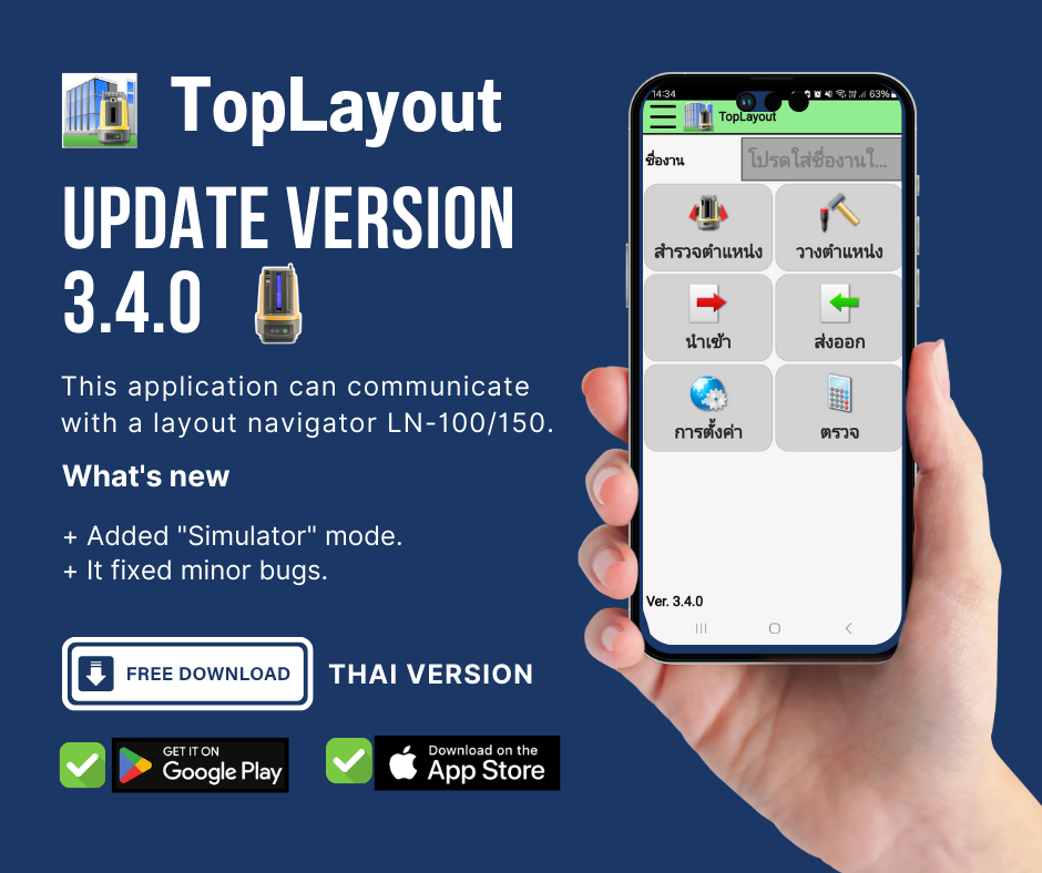 This application can communicate with a layout navigator LN-100/150. By using this, you can perform the layout work of 3-dimensional design data and as-build measurement of 3-dimensional point data.